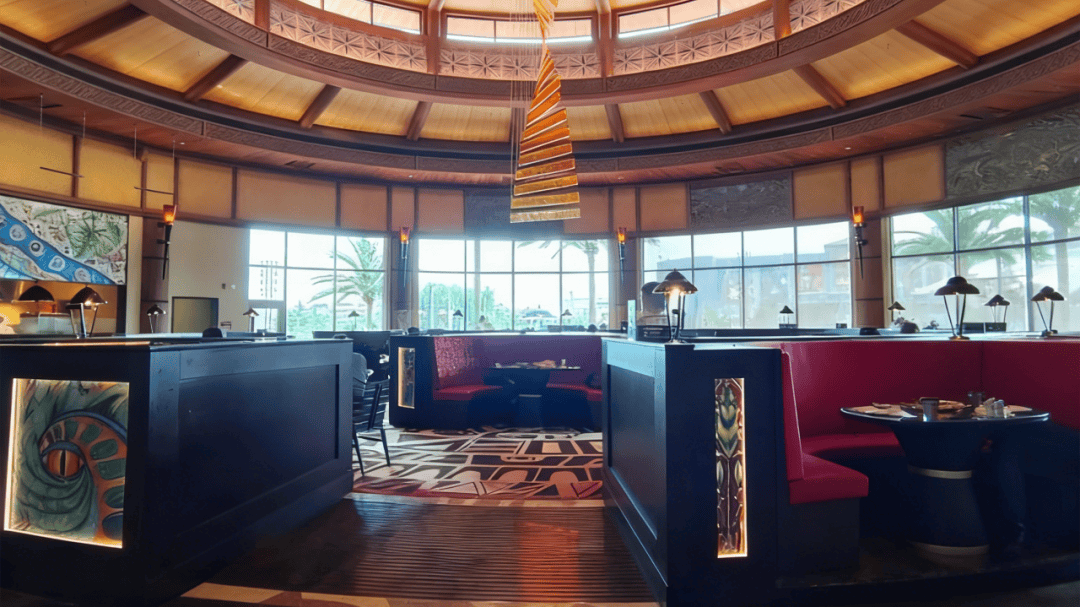 主题餐厅以电影《侏罗纪世界》为灵感,打造沉浸式用餐体验。餐厅内装饰充满恐龙元素,如恐龙壁画、复制品等,仿佛置身努布拉岛。菜品融合西餐与川菜风味,既有墨鱼意面、炙烤加吉鱼等精致菜肴,也有恐龙蛋甜品等创意点心。餐厅靠窗位置可俯瞰湖景及好莱坞大道,适合边用餐边欣赏园区风光,是影迷和家庭游客的热门之选。