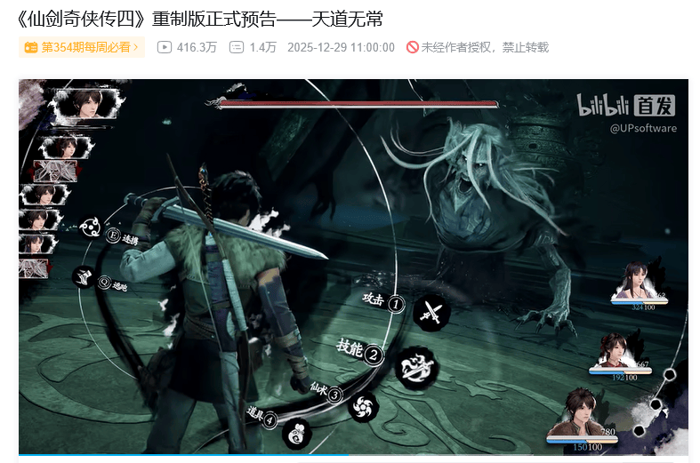 【3】12月29日,由UP software研发、方块游戏发行的回合制RPG单机游戏《仙剑奇侠传四》重制版,发布了正式预告。但预告发布不久后,由于其实机战斗在UI设计、运镜和交互方式等方面的表现酷似2025年的线号远征队》,引发了社区热议。目前,该PV在B站的播放量已经超过400万。