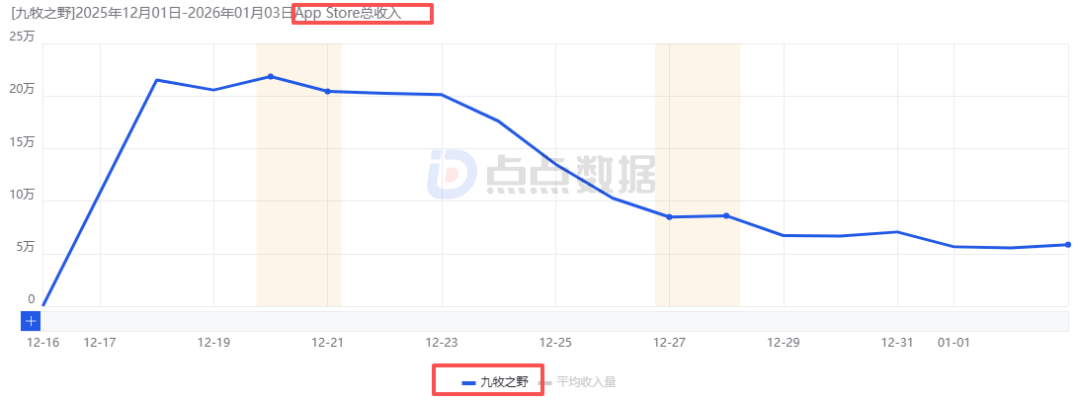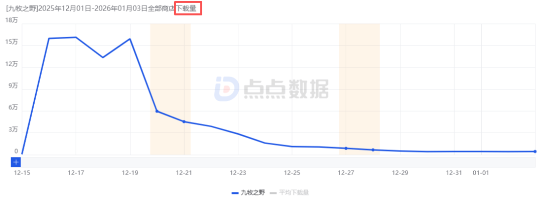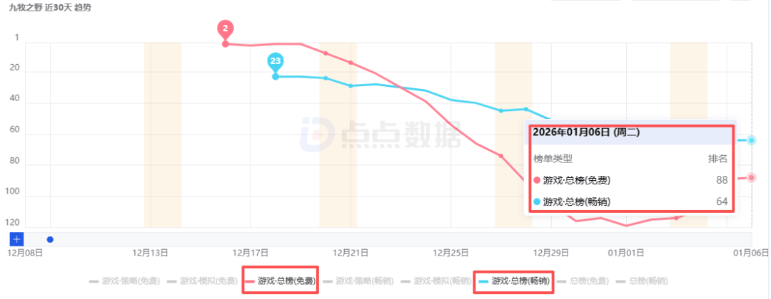 点点数据显示,《九牧之野》提前两天开启预下载,预下载首日(12月16日)就冲上iOS游戏免费榜TOP2,公测当天免费榜依然维持在此位置,iOS游戏畅销榜则登上了23名,目前(1月6日)其位于iOS游戏免费榜88名,畅销榜第64名。