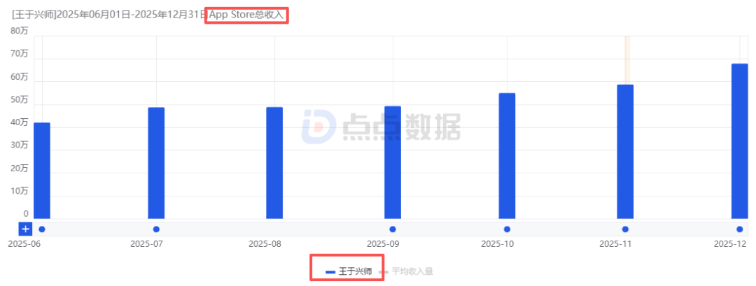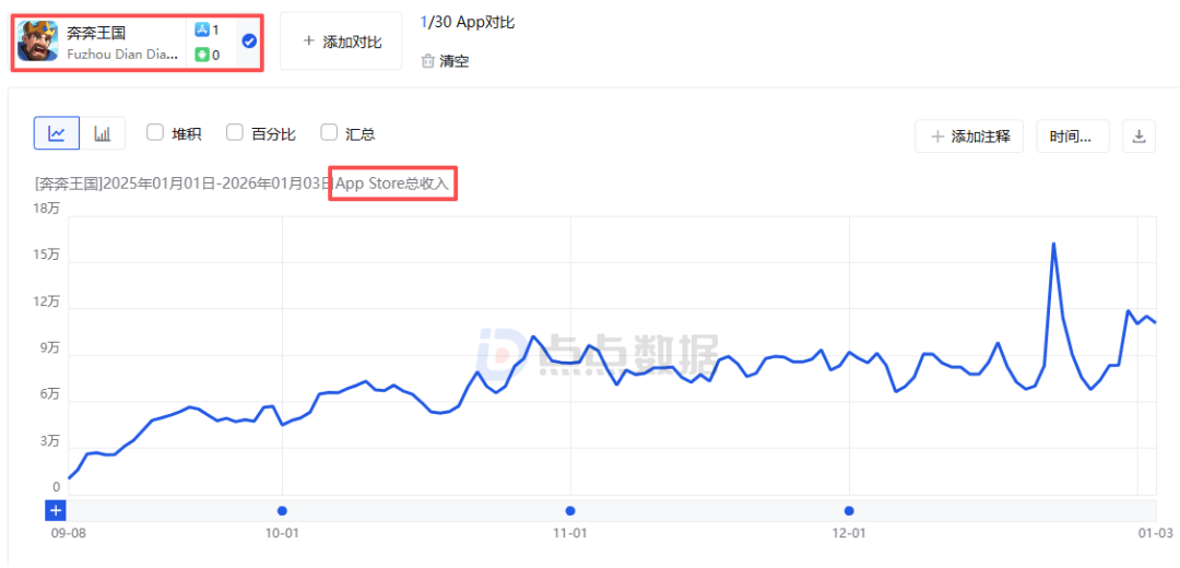 除《三国:冰河时代》外,9月上线点点互动旗下出海转内销的《奔奔王国》(国际服《Kingshot》)也是一款实现长线增长的产品,同时也是目前表现第二好、唯二12月iOS月流水破千万的SLG新游,iOS端月流水从首月的991万增长到当下的1870万,国内外的两边开花再次证明了该作的实力。