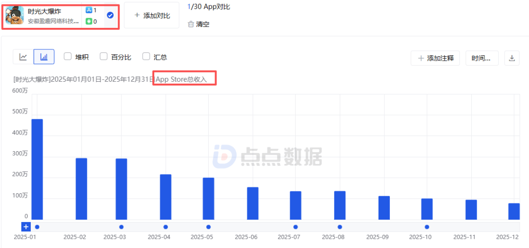 《时光大爆炸》(前期模拟经营)作为今年上线的首款SLG,首月iOS流水达到3500万是今年所有SLG新游中最顶的,但之后其一直缓慢的下滑状态中,12月iOS流水已经不足600万。
