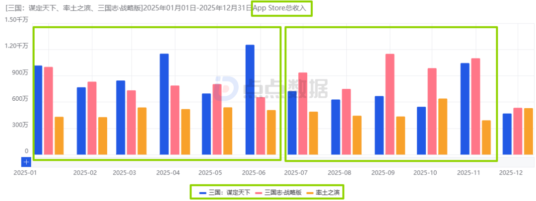 整个2025年,《三战》在国内iOS端斩获流水最高达到7.2亿元,《三谋》略低一些为6.9亿元,《率土之滨》则仅有4.12亿元排名最末,若细看趋势,上半年《三谋》月流水一直是当之无愧的第一,下半年开始《三战》逆袭为头名。
