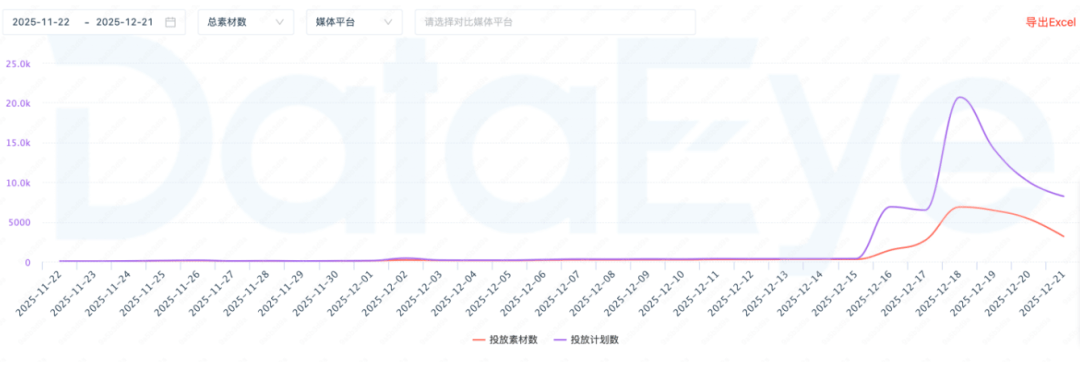 对应下载量,简单看一下该作的投放情况,游戏提前一个月(11月中旬)开始小规模买量,据DataEye报道,彼时日均投放不足100条,直到公测前两天量级才开始拉升,公测当天达到峰值,但很快开始下滑。