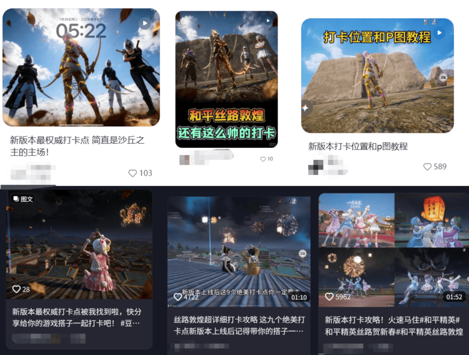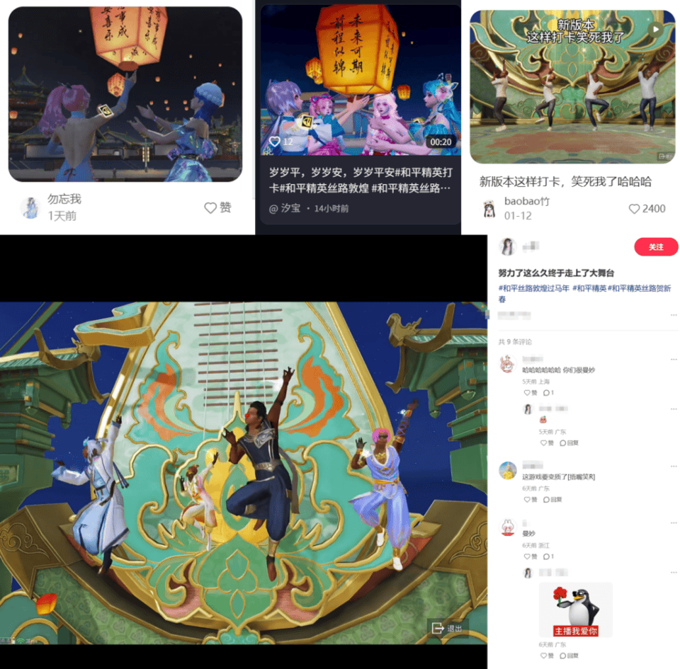 线下,新春版本落地敦煌沙洲夜市花灯展、十米《敦煌吃鸡图》展出、鸣沙山百驼祈福等线下社交活动,让数字年味与祈愿仪式延伸至现实,也吸引了大量玩家计划、甚至是已经冲向敦煌打卡游览。