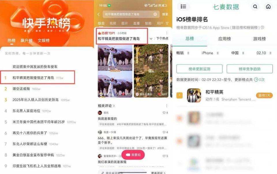 最直接的证据是,每年春节版本上线后,《和平精英》玩家活跃度都会出现新一涨,有超9000万玩家进入游戏内,随着2月初马年春节版本「丝路贺新春」上线,根据七麦数据显示,《和平精英》自2月7日起连续3天霸榜总榜畅销榜第一。话题#和平精英把敦煌做进了海岛 在多个内容平台热榜高位,连续多日在各大平台引发热议。