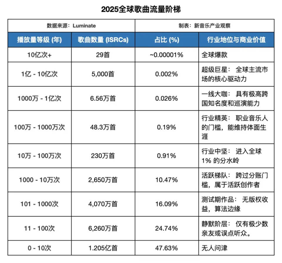 每天至少有超过10万首歌曲上传到各大音乐平台,但整个2025年,只有29首歌曲的播放量超过10亿次。Luminate估计,播放量在100万至5000万次之间的歌曲约有54.1万首歌曲,这些歌曲占据了近半数的播放量,构成了音乐消费的“主力军”,数量却仅占歌曲总量的2.14%。