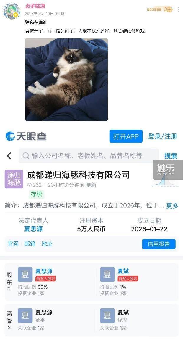 4月10日,国产单机游戏《明末:渊虚之羽》(以下简称《明末》)陷入风波:网传制作人夏思源已被开发团队灵泽科技开除。B站UP主贞子姑娘发布的动态疑似回应了该条消息。天眼查显示,夏思源已于2026年1月22日成立成都递归海豚科技有限公司。