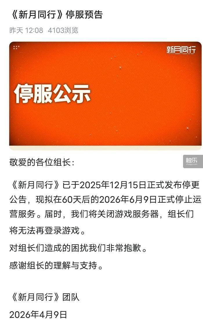 4月9日,新怪谈二游《新月同行》发布公告,游戏将于6月9日正式停止运营。届时所有服务器将关闭,玩家无法再登录游戏。这也是继2025年12月宣布停止内容更新后,《新月同行》正式说出告别,游戏上线年半。