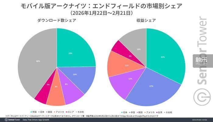 近日,Sensor Tower公开鹰角网络《明日方舟:终末地》的首月营收报告。报告显示,在2026年1月22日至2月21日,日本市场成为第一大收入市场,移动端收入份额中占比32%,超越中国大陆市场(25%)。