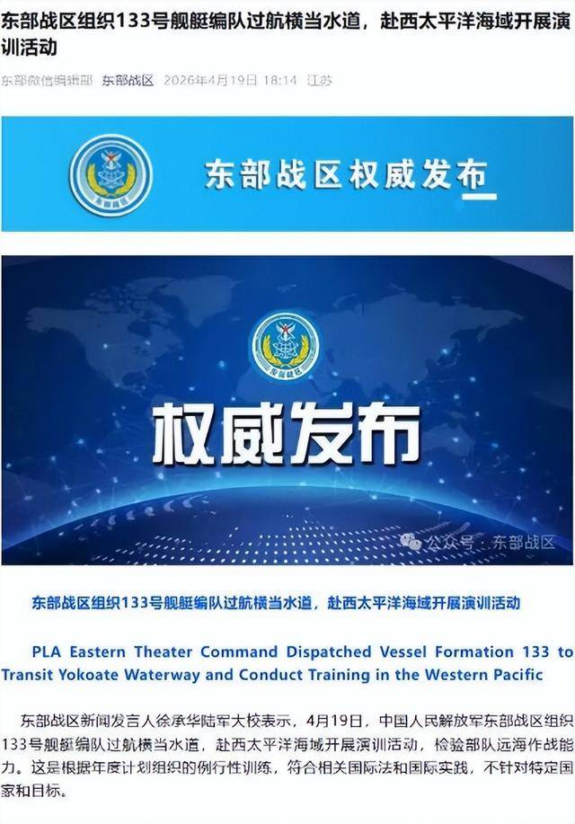 几乎就在同一时间,东海的另一侧,动了,东部战区宣布,133号舰艇编队过航横当水道,前往西太平洋演训。